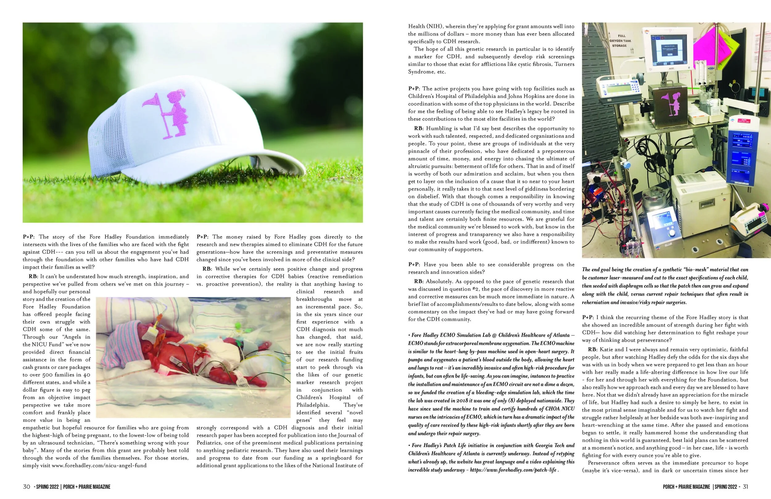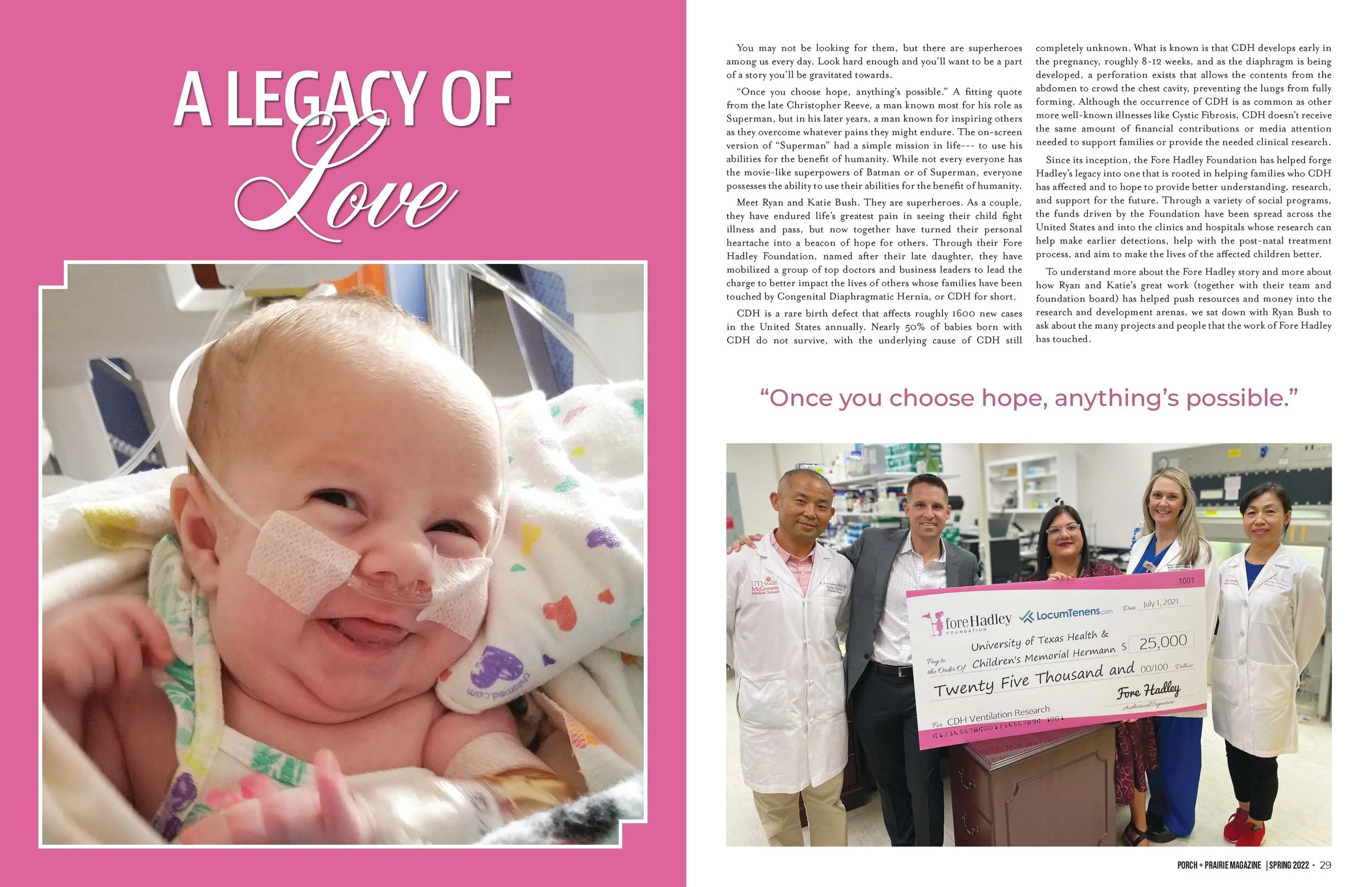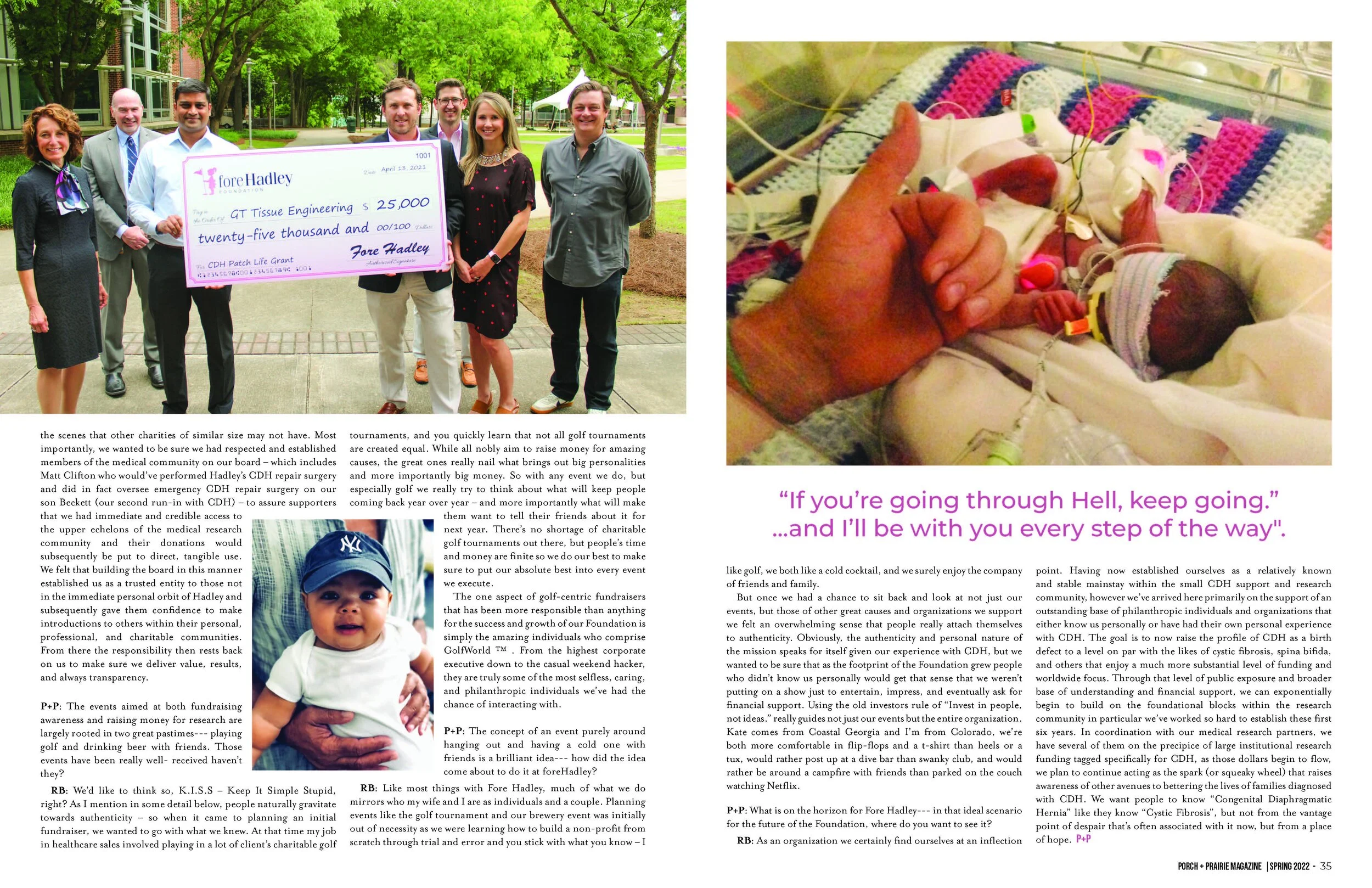 We were honored and very humbled to have been approached by Editor in Chief, Peder von Harten and his wonderful team at Porch and Prairie regarding an article on the work of Fore Hadley in their Spring 2022 edition. Through their extensive reach of subscribers and partners we’re so excited to continue spreading awareness of Congenital Diaphragmatic Hernia with the world, and know this will open up some exciting new channels of support for our research fund.